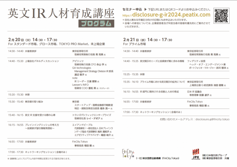 「英文IR人材育成講座」は、一般社団法人東京国際金融機構と、株式会社日本取引所グループ・株式会社東京証券取引所が共催するセミナーで、2月20日(火)と2月21日(水)に開催されました。
